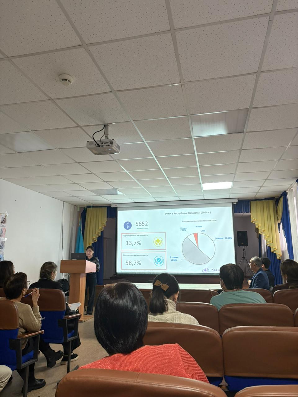 5 ноября на нашей базе КГОМБ был проведен мастер класс на тему: «Ранняя диагностика онкологических заболеваний» для сотрудников смотровых кабинетов ПМСП. Лекции проводили специалисты из Алматы КазНИИОиР Оспанов Даулет Серикович онкоуролог, Дюсембаев Акжол Кабдоллаевич зав отделением торакоабдоминальной онкологии, Арузат Саядиловна онкомаммолог и заведующая поликлиникой КГОМБ Дисаенко Ксения Сергеевна.